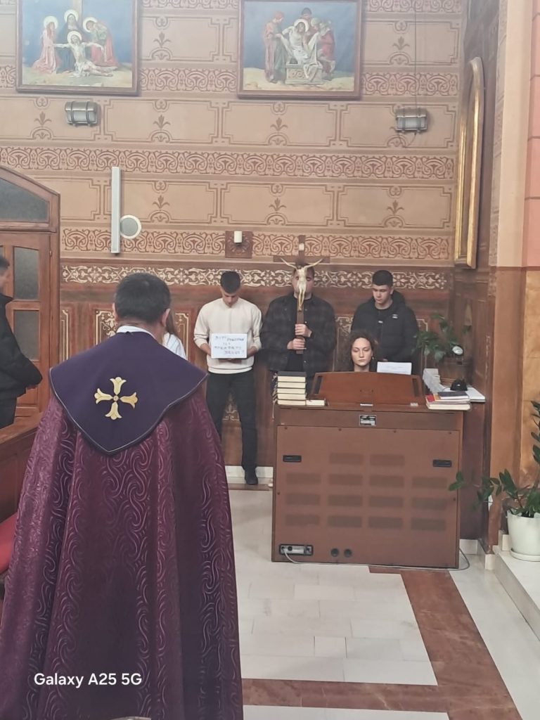 U korizmenom milosnom hodu u petak, 13. ožujka 2026., učenici trećeg i četvrtog razreda gimnazije Katoličkog školskog centra „Petar Barbarić“ Travnik sudjelovali su u pobožnosti Put križa pod geslom „Pred križem“. ,